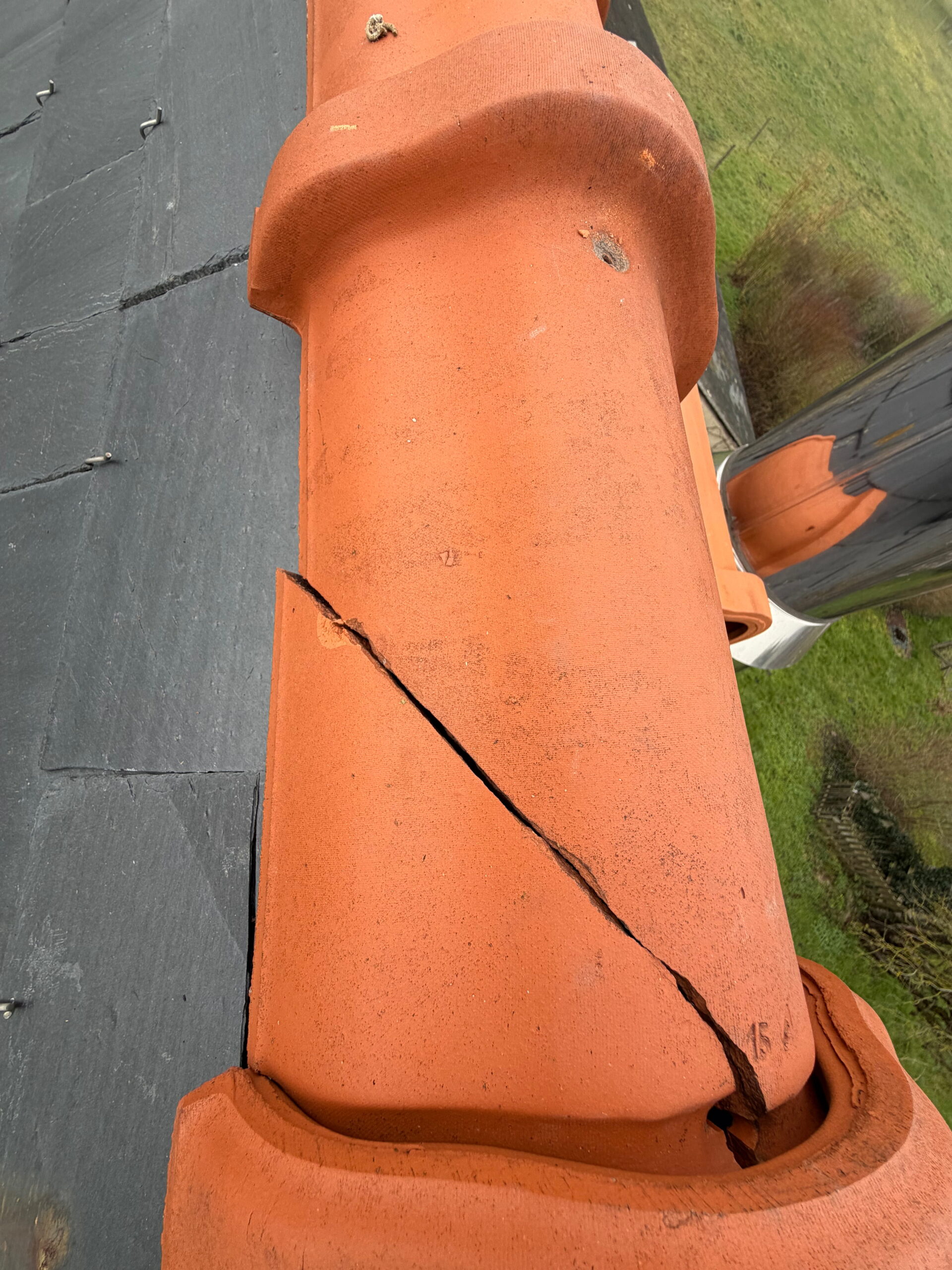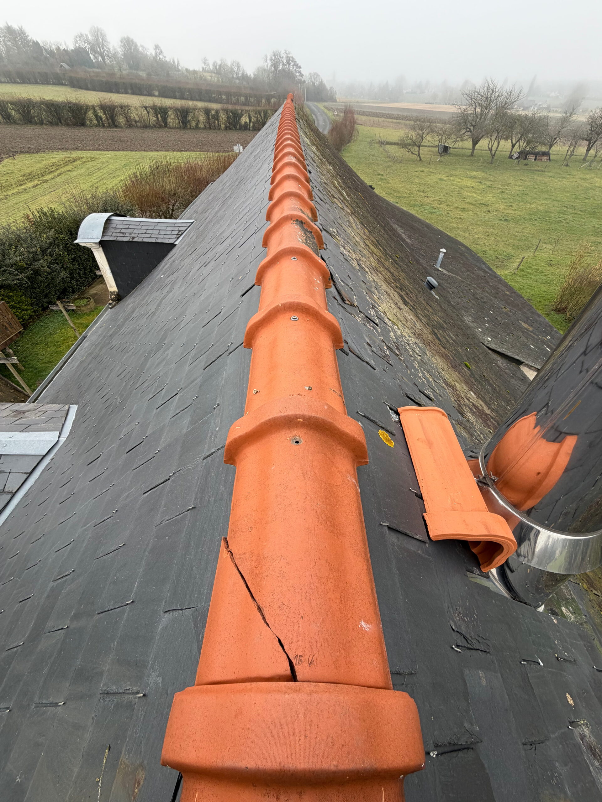 À la suite d’une infiltration d’eau constatée sur la charpente, une intervention rapide sur la toiture s’est imposée afin d’éviter toute aggravation. Les travaux ont consisté au remplacement complet de la faîtière, une étape essentielle pour garantir la solidité et l’étanchéité du toit. Pour renforcer la protection, un joint d’étanchéité à base de bitume a été soigneusement appliqué entre chaque faîtière, assurant ainsi une barrière efficace contre l’humidité et les intempéries. Cette réparation permet désormais de préserver durablement la charpente et d’assurer une toiture parfaitement étanche sur le secteur de Cornillé-les-Caves